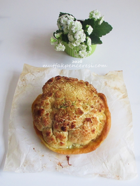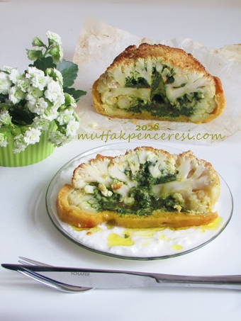 Yabancı kanallarda gördüğüm bu tarifi hazırladım,karnabaharı her türlü fırında kızartma,salatası,etli yemeğini,bol yeşilikli mücveri ,yoğurtlu mantısı seven biri olarak sevdim,ister yoğurtla meze gibi tüketin isterseniz sade olarak turta gibi tüketin, sizlerde hazırlamak isterseniz buyurun tarif.